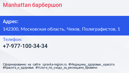 Manhattan, барбершоп по адресу 142300, Московская область, Чехов, Полиграфистов, 1 в дальнейшем Организация, размещена в следующих категориях: