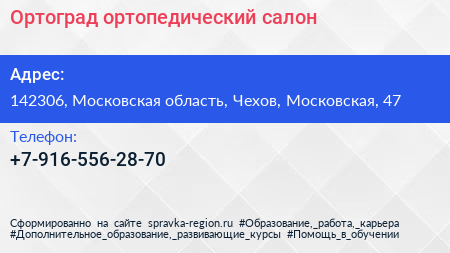 Ортоград, ортопедический салон по адресу 142306, Московская область, Чехов, Московская, 47 в дальнейшем Организация, размещена в следующих категориях: