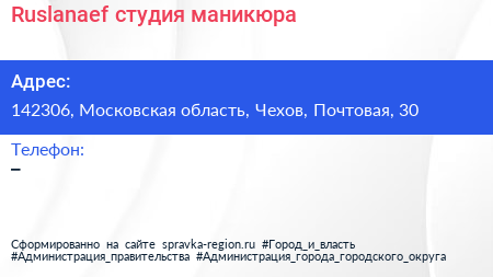 Ruslanaef, студия маникюра по адресу 142306, Московская область, Чехов, Почтовая, 30 в дальнейшем Организация, размещена в следующих категориях: