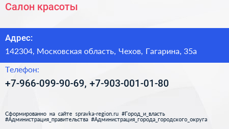 Салон красоты по адресу 142304, Московская область, Чехов, Гагарина, 35а в дальнейшем Организация, размещена в следующих категориях: