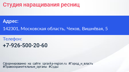 Студия наращивания ресниц по адресу 142301, Московская область, Чехов, Вишнёвая, 5 в дальнейшем Организация, размещена в следующих категориях: