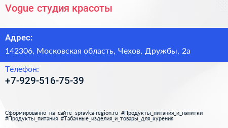 Vogue, студия красоты по адресу 142306, Московская область, Чехов, Дружбы, 2а в дальнейшем Организация, размещена в следующих категориях: