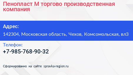 Пенопласт-М, торгово-производственная компания по адресу 142304, Московская область, Чехов, Комсомольская, вл3 в дальнейшем Организация, размещена в следующих категориях: