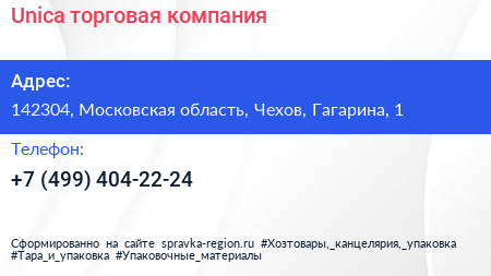Unica, торговая компания по адресу 142304, Московская область, Чехов, Гагарина, 1 в дальнейшем Организация, размещена в следующих категориях: