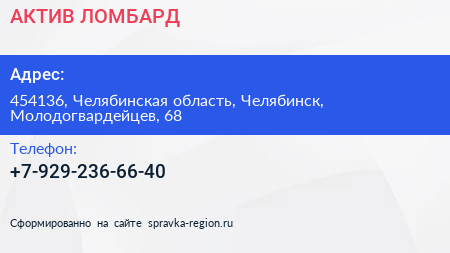 АКТИВ ЛОМБАРД по адресу 454136, Челябинская область, Челябинск, Молодогвардейцев, 68 в дальнейшем Организация, размещена в следующих категориях: