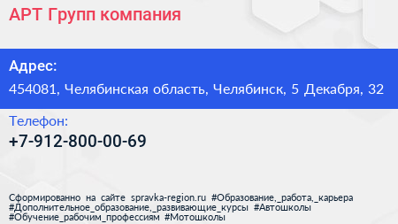 АРТ-Групп, компания по адресу 454081, Челябинская область, Челябинск, 5 Декабря, 32 в дальнейшем Организация, размещена в следующих категориях:
