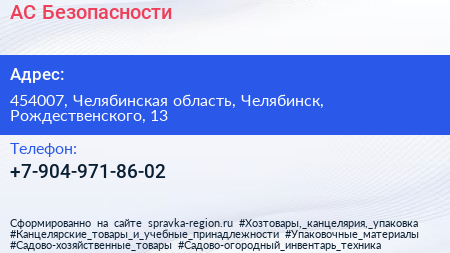 АС Безопасности по адресу 454007, Челябинская область, Челябинск, Рождественского, 13 в дальнейшем Организация, размещена в следующих категориях: