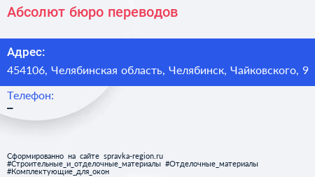 Абсолют, бюро переводов по адресу 454106, Челябинская область, Челябинск, Чайковского, 9 в дальнейшем Организация, размещена в следующих категориях: