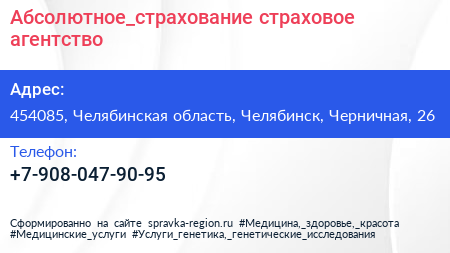 Абсолютное_страхование, страховое агентство по адресу 454085, Челябинская область, Челябинск, Черничная, 26 в дальнейшем Организация, размещена в следующих категориях:
