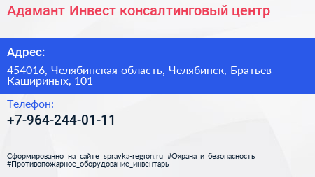 Адамант-Инвест, консалтинговый центр по адресу 454016, Челябинская область, Челябинск, Братьев Кашириных, 101 в дальнейшем Организация, размещена в следующих категориях: