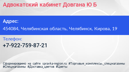 Адвокатский кабинет Довгана Ю.Б. по адресу 454084, Челябинская область, Челябинск, Кирова, 19 в дальнейшем Организация, размещена в следующих категориях: