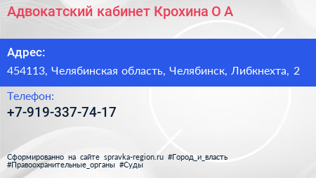Адвокатский кабинет Крохина О.А. по адресу 454113, Челябинская область, Челябинск, Либкнехта, 2 в дальнейшем Организация, размещена в следующих категориях: