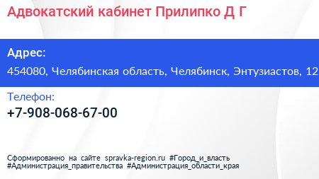 Адвокатский кабинет Прилипко Д.Г. по адресу 454080, Челябинская область, Челябинск, Энтузиастов, 12 в дальнейшем Организация, размещена в следующих категориях: