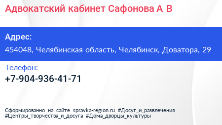 Адвокатский кабинет Сафонова А.В. по адресу 454048, Челябинская область, Челябинск, Доватора, 29 в дальнейшем Организация, размещена в следующих категориях: