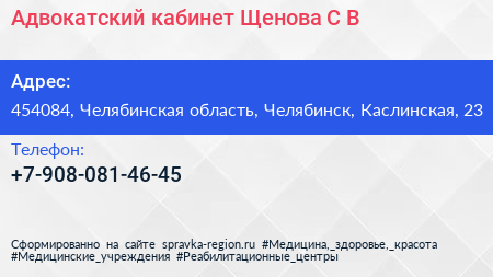 Адвокатский кабинет Щенова С.В. по адресу 454084, Челябинская область, Челябинск, Каслинская, 23 в дальнейшем Организация, размещена в следующих категориях: