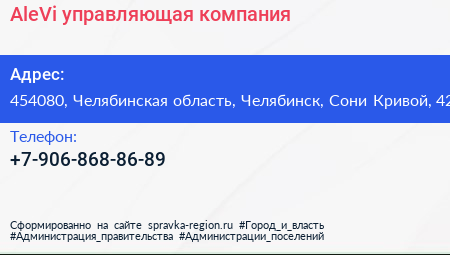 AleVi, управляющая компания по адресу 454080, Челябинская область, Челябинск, Сони Кривой, 42 в дальнейшем Организация, размещена в следующих категориях: