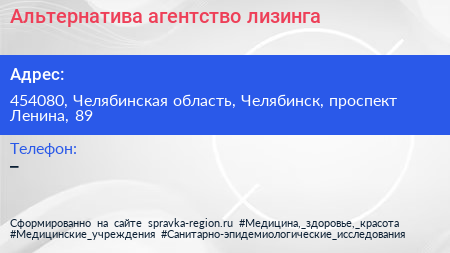 Альтернатива, агентство лизинга по адресу 454080, Челябинская область, Челябинск, проспект Ленина, 89 в дальнейшем Организация, размещена в следующих категориях: