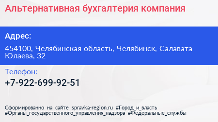 Альтернативная бухгалтерия, компания по адресу 454100, Челябинская область, Челябинск, Салавата Юлаева, 32 в дальнейшем Организация, размещена в следующих категориях: