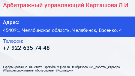 Арбитражный управляющий Карташова Л.И. по адресу 454091, Челябинская область, Челябинск, Васенко, 4 в дальнейшем Организация, размещена в следующих категориях: