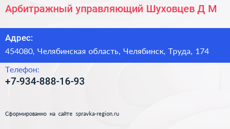 Арбитражный управляющий Шуховцев Д.М. по адресу 454080, Челябинская область, Челябинск, Труда, 174 в дальнейшем Организация, размещена в следующих категориях:
