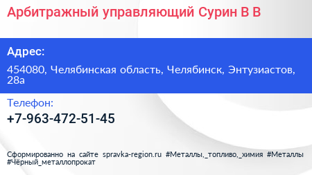 Арбитражный управляющий Сурин В.В. по адресу 454080, Челябинская область, Челябинск, Энтузиастов, 28а в дальнейшем Организация, размещена в следующих категориях: