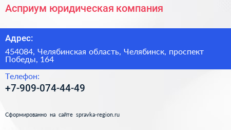 Асприум, юридическая компания по адресу 454084, Челябинская область, Челябинск, проспект Победы, 164 в дальнейшем Организация, размещена в следующих категориях: