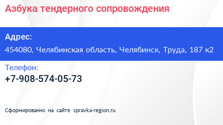 Азбука тендерного сопровождения по адресу 454080, Челябинская область, Челябинск, Труда, 187 к2 в дальнейшем Организация, размещена в следующих категориях: