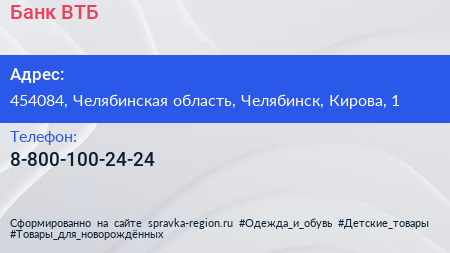 Банк ВТБ по адресу 454084, Челябинская область, Челябинск, Кирова, 1 в дальнейшем Организация, размещена в следующих категориях: