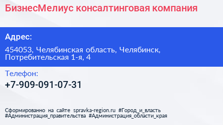 БизнесМелиус, консалтинговая компания по адресу 454053, Челябинская область, Челябинск, Потребительская 1-я, 4 в дальнейшем Организация, размещена в следующих категориях: