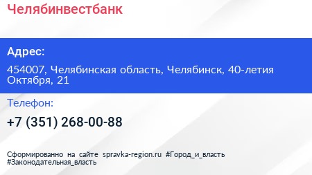 Челябинвестбанк по адресу 454007, Челябинская область, Челябинск, 40-летия Октября, 21 в дальнейшем Организация, размещена в следующих категориях: