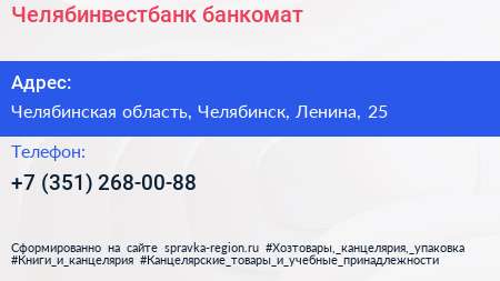 Челябинвестбанк, банкомат по адресу Челябинская область, Челябинск, Ленина, 25 в дальнейшем Организация, размещена в следующих категориях: