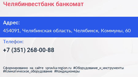 Челябинвестбанк, банкомат по адресу 454091, Челябинская область, Челябинск, Коммуны, 60 в дальнейшем Организация, размещена в следующих категориях: