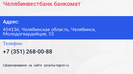 Челябинвестбанк, банкомат по адресу 454136, Челябинская область, Челябинск, Молодогвардейцев, 53 в дальнейшем Организация, размещена в следующих категориях: