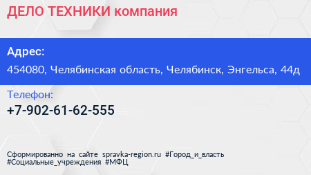 ДЕЛО ТЕХНИКИ, компания по адресу 454080, Челябинская область, Челябинск, Энгельса, 44д в дальнейшем Организация, размещена в следующих категориях: