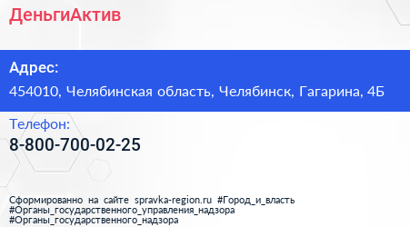 ДеньгиАктив по адресу 454010, Челябинская область, Челябинск, Гагарина, 4Б в дальнейшем Организация, размещена в следующих категориях: