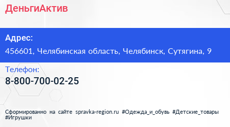 ДеньгиАктив по адресу 456601, Челябинская область, Челябинск, Сутягина, 9 в дальнейшем Организация, размещена в следующих категориях: