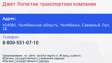 Джет Логистик, транспортная компания по адресу 454081, Челябинская область, Челябинск, Северный Луч, 1Б в дальнейшем Организация, размещена в следующих категориях:
