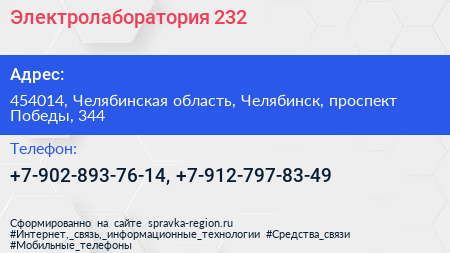 Электролаборатория №232 по адресу 454014, Челябинская область, Челябинск, проспект Победы, 344 в дальнейшем Организация, размещена в следующих категориях: