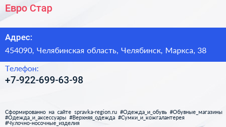 Евро-Стар по адресу 454090, Челябинская область, Челябинск, Маркса, 38 в дальнейшем Организация, размещена в следующих категориях: