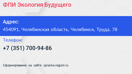 ФПИ Экология Будущего по адресу 454091, Челябинская область, Челябинск, Труда, 78 в дальнейшем Организация, размещена в следующих категориях: