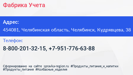 Фабрика Учета по адресу 454081, Челябинская область, Челябинск, Кудрявцева, 38 в дальнейшем Организация, размещена в следующих категориях: