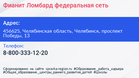 Фианит-Ломбард, федеральная сеть по адресу 456625, Челябинская область, Челябинск, проспект Победы, 13 в дальнейшем Организация, размещена в следующих категориях: