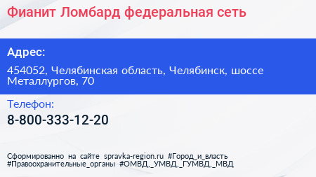 Фианит-Ломбард, федеральная сеть по адресу 454052, Челябинская область, Челябинск, шоссе Металлургов, 70 в дальнейшем Организация, размещена в следующих категориях: