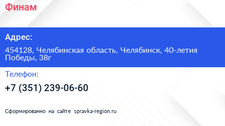 Финам по адресу 454128, Челябинская область, Челябинск, 40-летия Победы, 38г в дальнейшем Организация, размещена в следующих категориях: