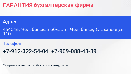 ГАРАНТИЯ, бухгалтерская фирма по адресу 454046, Челябинская область, Челябинск, Стахановцев, 110 в дальнейшем Организация, размещена в следующих категориях: