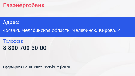 Газэнергобанк по адресу 454084, Челябинская область, Челябинск, Кирова, 2 в дальнейшем Организация, размещена в следующих категориях: