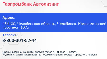 Газпромбанк Автолизинг по адресу 454100, Челябинская область, Челябинск, Комсомольский проспект, 107а в дальнейшем Организация, размещена в следующих категориях: