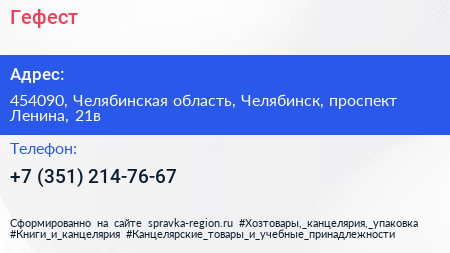 Гефест по адресу 454090, Челябинская область, Челябинск, проспект Ленина, 21в в дальнейшем Организация, размещена в следующих категориях: