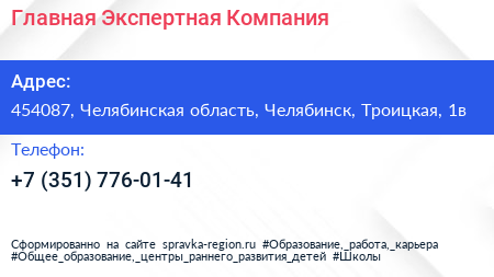 Для связи с организацией воспользуйтесь номером телефона: +7 (351) 776-01-41. Пн: c 09:00-18:00, Вт: c 09:00-18:00, Ср: c 09:00-18:00, Чт: c 09:00-18:00, Пт: c 09:00-18:00, Сб: выходной, Вс: выходной, вы можете обратиться в эту организацию.