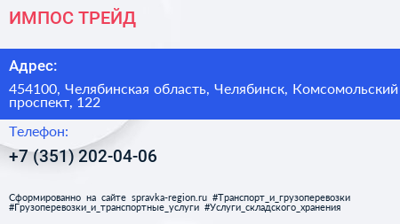 ИМПОС ТРЕЙД по адресу 454100, Челябинская область, Челябинск, Комсомольский проспект, 122 в дальнейшем Организация, размещена в следующих категориях: